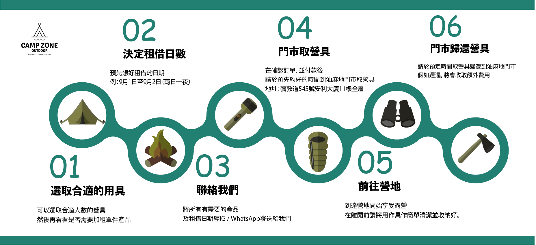 在租借營具時,客人可以自由選擇所需日數,當中可以提早一日提取營具,而在活動完結後一天歸還營具。