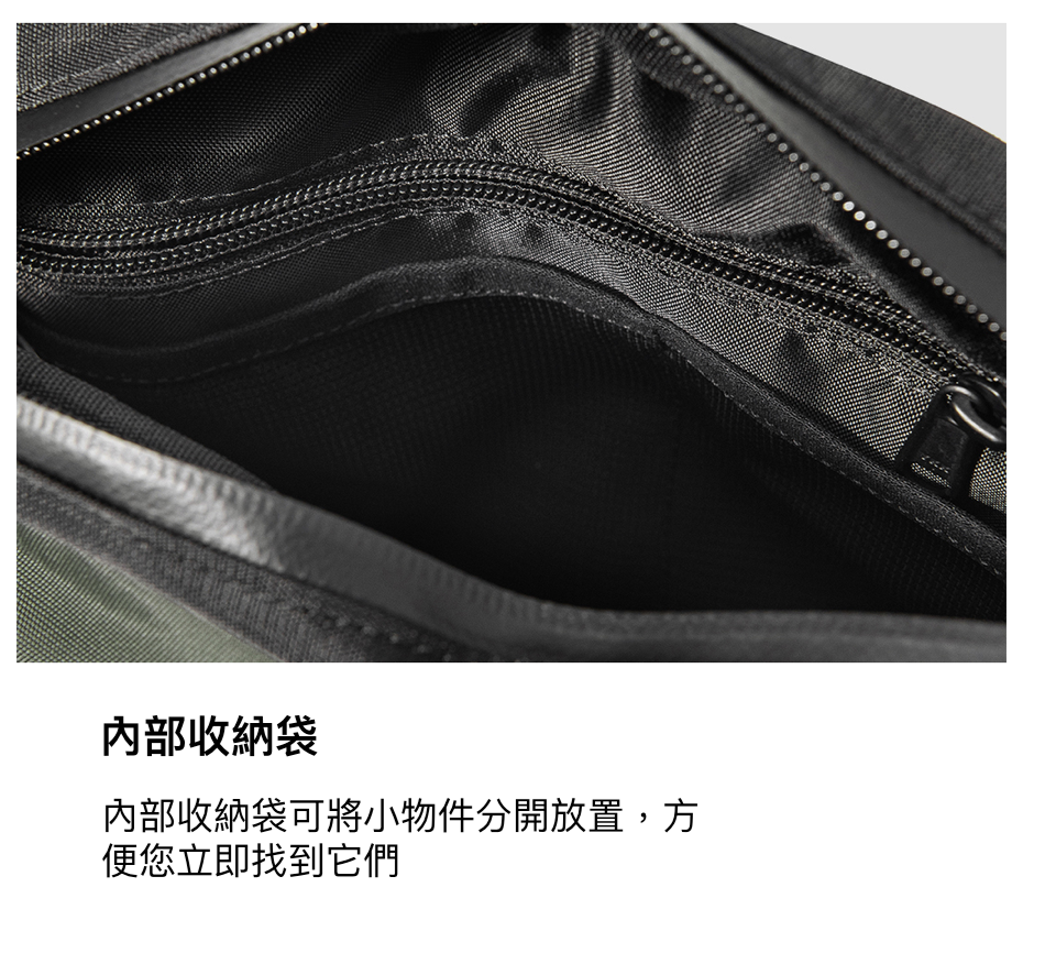 • 它分為三個隔層:可以用水拉鍊閉合的主體、一個大口袋和一個可以快速放入和取出的口袋