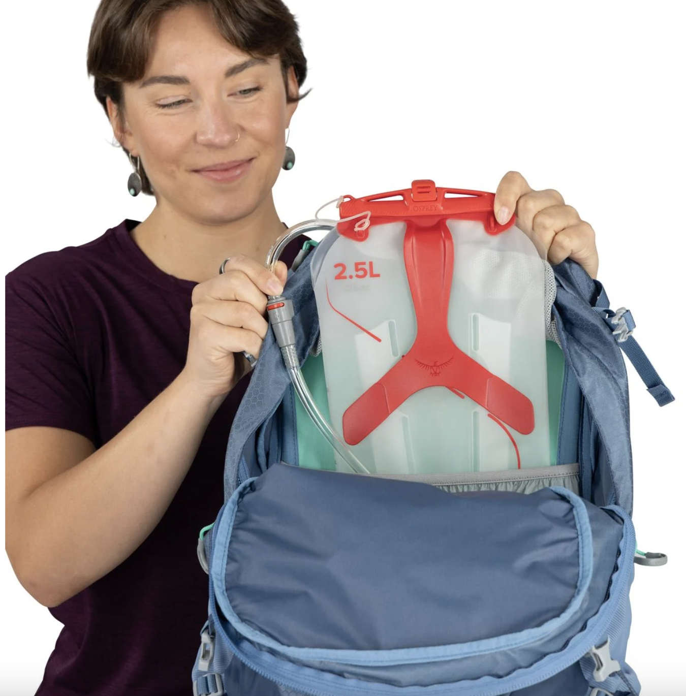 • 內建水袋套,水管出口設於背板,附 Hydraclip 掛鉤,可加購 3L 水袋